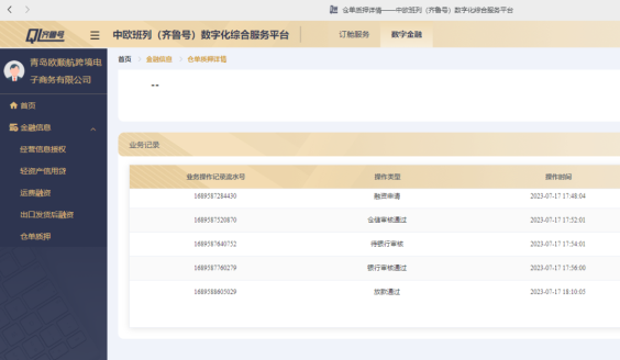 2023年7月17日,青岛欧顺航跨境电子商务有限公司在青岛农商行的协助下,办理了首笔仓单质押融资业务,标志着跨境金融服务平台中欧班列“齐鲁号”仓单融资业务在青岛率先落地,上合示范区“物流+贸易+金融”模式应用再添新场景